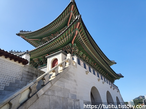 경복궁에 들어서서 왼쪽 방향 모서리 쪽에서 바라볼 때 가장 멋지다는 가이드님의 설명.