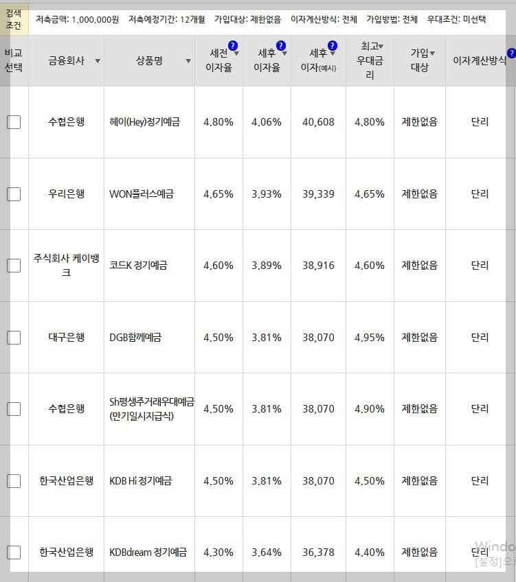 예금금액 : 1,000,000원 / 저축기간 : 12개월 / 은행으로 검색했더니 아래 같이 나왔다