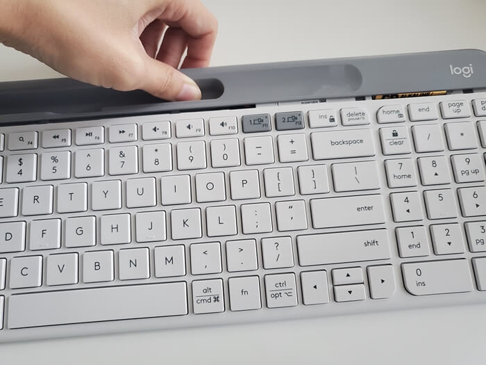 이 회색 슬롯부분을 위로 가볍게 올리면 배터리와 유니파잉 USB 수신기를 확인할 수 있다. 요즘 뭐든 충전식이 편하던데, 로지텍 K580키보드의 배터리 수명은 24개월이라니 그렇담 좀 더 저렴한 배터리형으로 구입하는 것이 낫겠다.