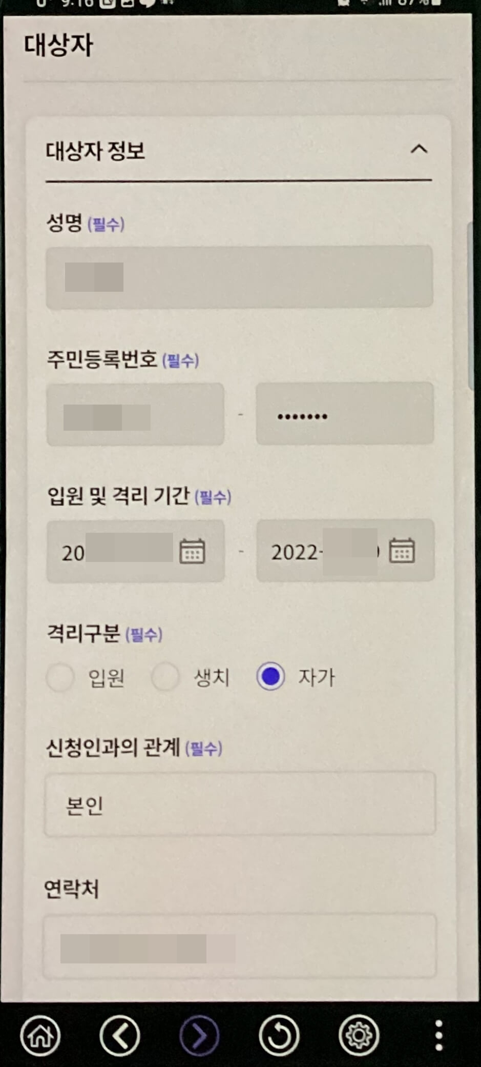 성명, 주민등록번호, 격리기간, 격리는 어디에서 했는지를 선택합니다. 하단에 지원금액이 나옵니다.